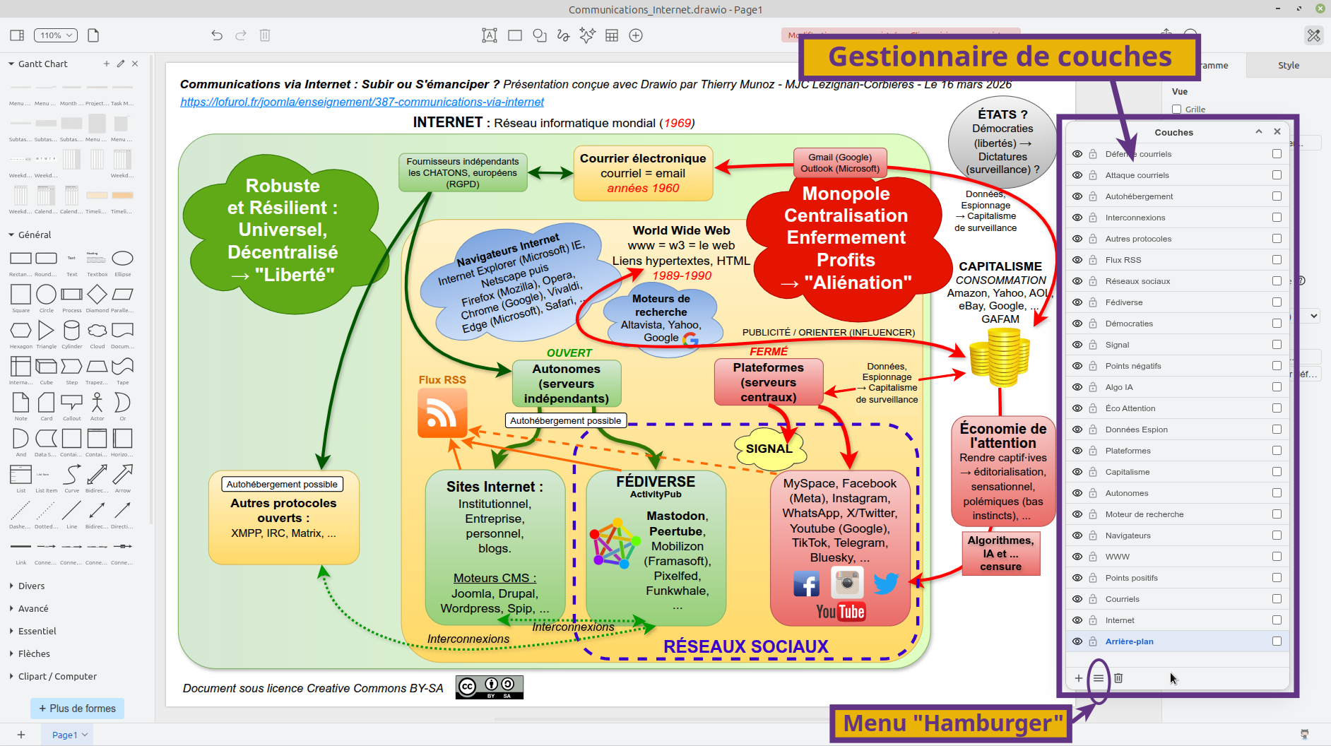 Remarque : On pourrait s'arrêter là et se servir du document tel quel pour notre conférence, directement dans Drawio (c'est ce que je faisais au début) mais je ne trouve pas que ça soit très pratique à cause des réglages à refaire à chaque démarrage pour l'affichage et avec obligation d'avoir le gestionnaire de couches à l'écran.